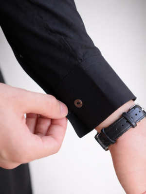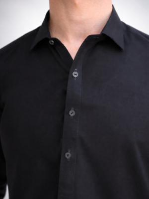 Featuring a sleek shirt collar, refined cuffs, and a rounded hem for a tailored finish, this piece is designed for the modern man who values both tradition and sophistication. The deep black hue adds a bold, versatile touch — perfect for both formal occasions and everyday wear.