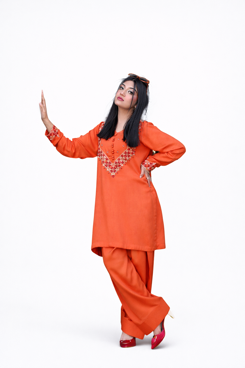 Introducing the stunning rust-colored dress, crafted from the finest premium-quality Silk Karandi fabric. The elegant design is elevated with intricate Tatreez embroidery, expertly executed using the highest quality Tila and threads, Paired with Latest Trend Farshi Shalwar, creating a beautifully stylish and sophisticated look.